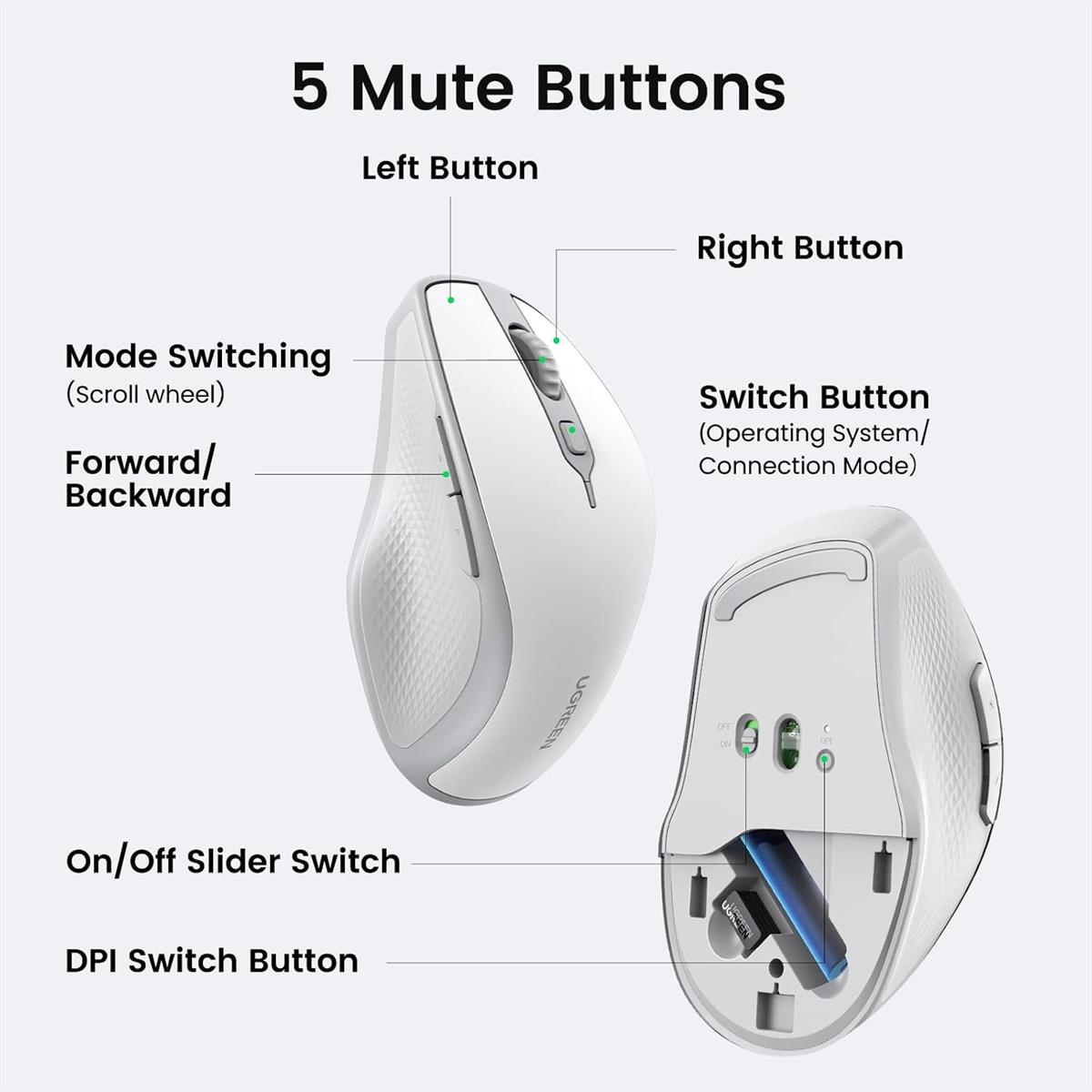 UGREEN Wireless Bluetooth Mouse offers two connection modes: Bluetooth 5.0 and wireless 2.4G, It supports seamless switching between the two modes with a simple button press, eliminating the need for repetitive connections.